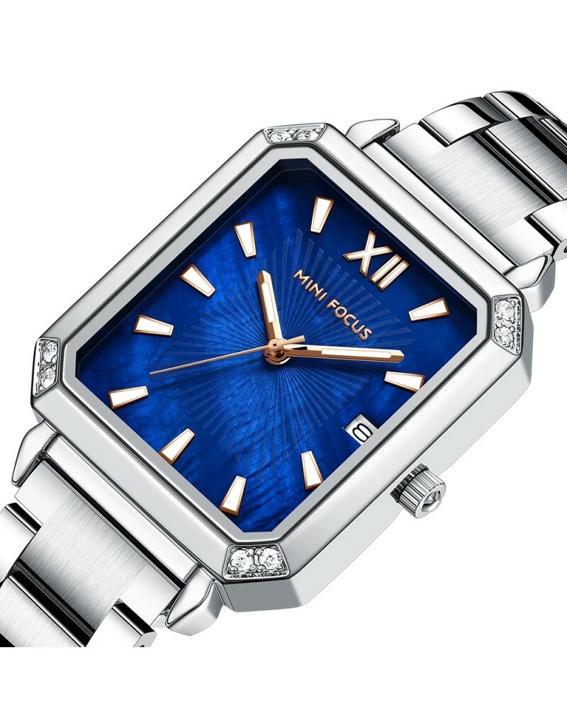 ساعة نسائية من علامة Mini Focus بتصميم فاخر وأنيق، تتميز باللون الفضي مع قرص مستطيل باللون الأزرق مزين ببعض الأحجار اللامعة في زوايا القرص، مما يضفي عليها لمسة من الرقي والتألق. هذه الساعة تجمع بين الأناقة والبساطة، مما يجعلها الخيار المثالي للمناسبات الخاصة والإطلالات اليومية.