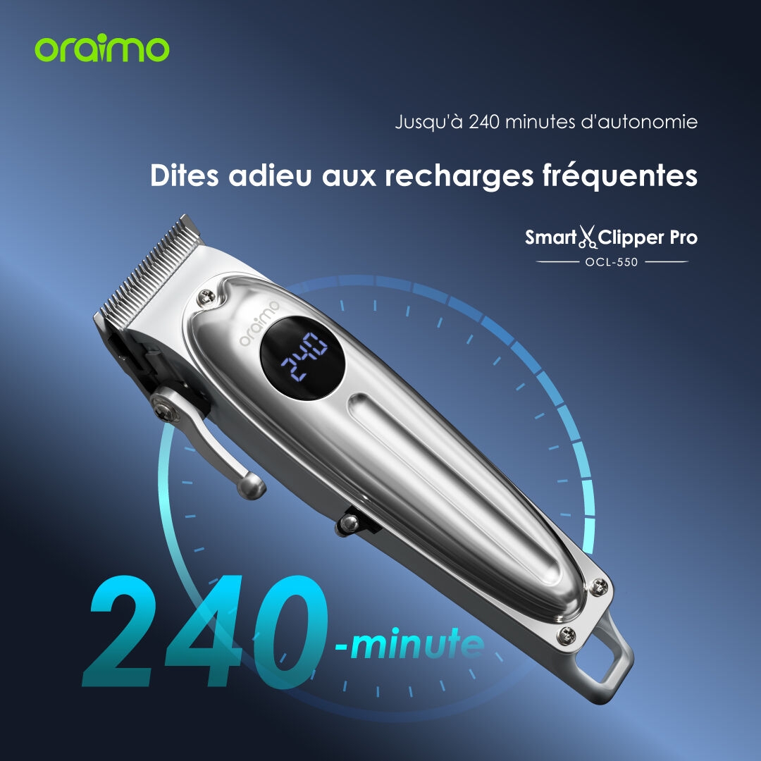 SmartClipper Pro offre jusqu'à 240 minutes de temps d'utilisation après 2 heures de charge complète. Il y a un indicateur sur l'écran pour montrer la batterie restante.