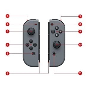 Joy-ConLes deux Joy-Con peuvent être utilisés de manière autonome, un dans chaque main, ou ensemble pour former une manette unique en les emboîtant de chaque coté du support Joy-Con. Ils peuvent être fixés à la console principale pour une utilisation en mode nomade, ou partagés avec un amis pour profiter de parties à deux joueurs dans les jeux compatibles. | Fonctionnalités Joy-ConChaque Joy-Con dispose de tous les boutons lui permettant de servir de manette à part entière. Chacun d'eux incorpore un accéléromètre, des vibrations HD avancées, et un gyroscope, ce qui permet d'utiliser la fonctionnalité de capteur de mouvements des deux Joy-Con de manière indépendante. | Joy-Con gaucheLe Joy-Con gauche dispose d'un bouton de capture d'écran qui permet aux joueurs de prendre instantanément des captures d'écran en cours de jeu afin de les partager avec des amis sur les réseaux sociaux. | Joy-Con droitLe Joy-Con droit incorpore une zone NFC qui permet d'interagir avec les amiibo, ainsi qu'une caméra infrarouge à détecteur de mouvements pouvant détecter la distance, la forme et le mouvement des objets à proximité dans les jeux conçus pour utiliser cette fonctionnalité. |