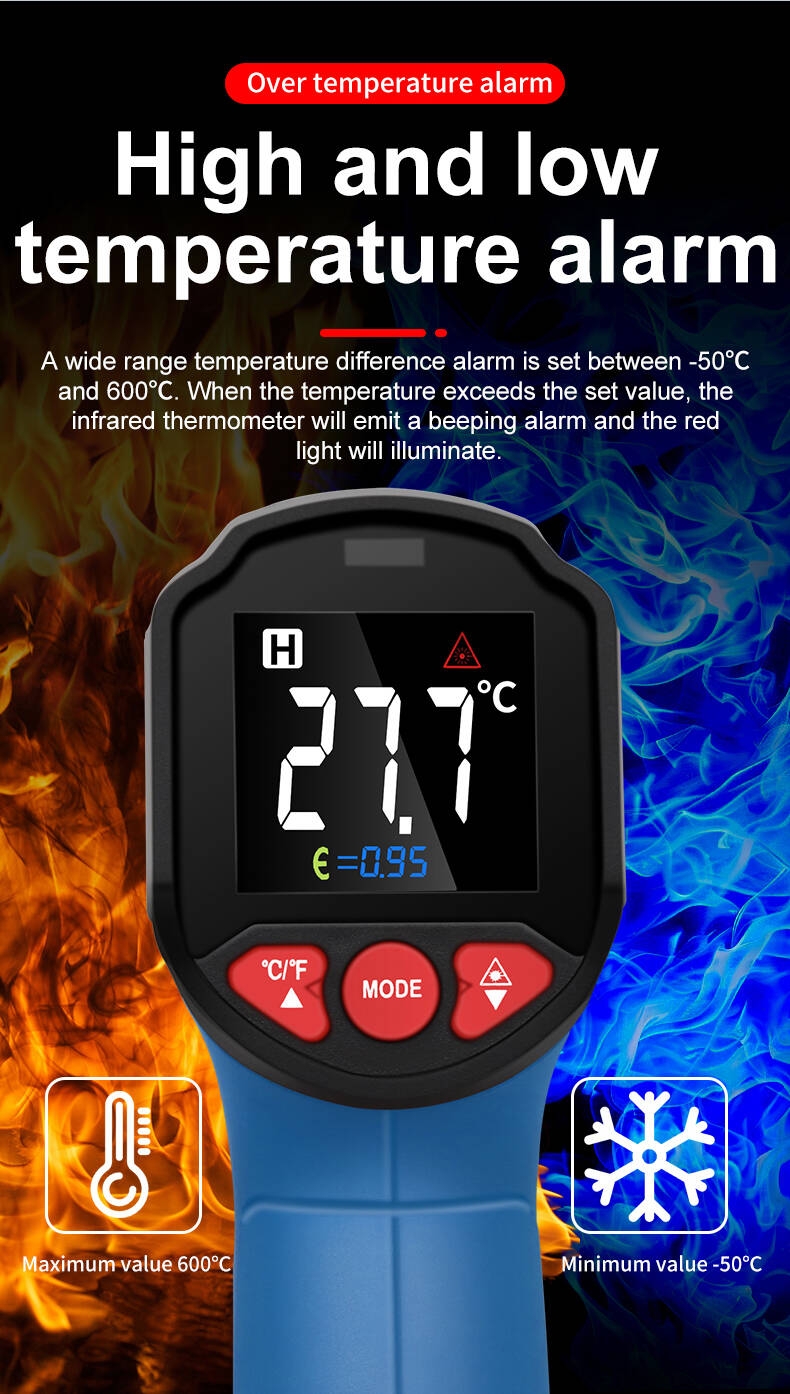 يغطّي نطاق قياس واسع من ‑50°C إلى 600°C (‑58°F إلى 1112°F) مع نسبة مسافة إلى نقطة D:S = 12:1، مما يجعله مناسباً لصيانة السيارات، المطابخ، التدفئة والتكييف، فحص المعدات الصناعية أو البحث عن النقاط الساخنة من مسافة آمنة. كما يمكن ضبط معامل الانبعاثية (القيمة الافتراضية 0.95) لتحسين الدقة حسب نوع السطح.