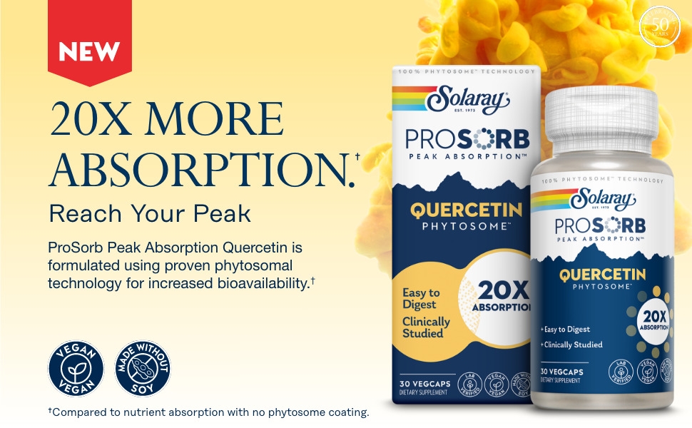 Loin de votre supplément de quercétine moyen, la quercétine ProSorb Peak Absorption est formulée à l'aide d'une technologie phytosomale éprouvée pour une biodisponibilité accrue. Vous bénéficiez ainsi d'un soutien puissant pour vous aider à vous sentir mieux.* Chaque capsule contient 250 mg de Quercefit Phytosome, un ingrédient cliniquement étudié qui est standardisé à 40% de quercétine. Il a été démontré que ce format d'administration phytosomique de pointe optimise l'absorption de la quercétine de 20 fois.† Cela signifie que vous pouvez profiter de tous les avantages de ce puissant flavonoïde sans vous soucier d'une absorption inefficace. Parce que les flavonoïdes agissent comme des antioxydants dans le corps, la quercétine peut aider à soutenir la santé et le bien-être en général.* Végétalien et fabriqué sans soja, Solaray Quercetin Phytosome est conçu pour les régimes alimentaires spécialisés, et sa biodisponibilité élevée le rend facile à digérer. Comme tous les produits Solaray, ProSorb Quercetin Phytosome est vérifié en laboratoire pour sa puissance, sa pureté et son identité. La confiance dans le nom Solaray n’est qu’une des raisons pour lesquelles nous existons depuis si longtemps et maintenons notre place de leader dans l’industrie. Contrairement à de nombreuses autres entreprises, nous fabriquons presque tous nos propres produits dans nos installations certifiées GMP et testons et sélectionnons minutieusement les ingrédients bruts dans notre laboratoire interne ultramoderne pour détecter la moindre quantité d'impuretés. Cela nous permet de gérer le processus de production du début à la fin afin de pouvoir offrir la meilleure qualité possible. Rassurez-vous, seules les formules les plus pures arrivent jamais dans votre armoire. Et parce que nous nous engageons toujours à laisser le monde un peu meilleur que celui dans lequel nous l'avons trouvé, nous emballons ce produit dans des bouteilles en plastique 100 % recyclées après consommation.