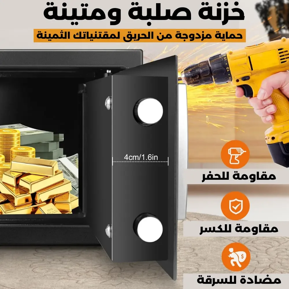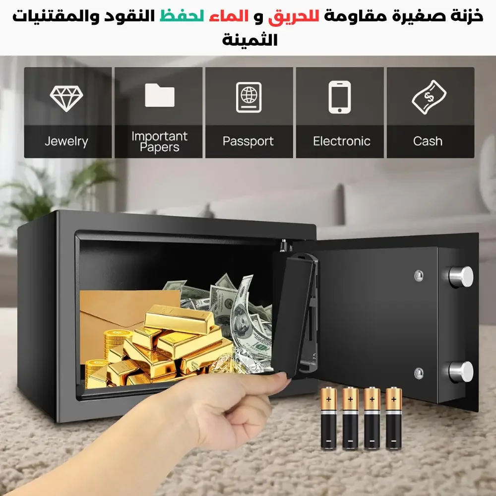 Équipé d’une porte en acier renforcé et de boulons de verrouillage solides avec charnières internes cachées pour empêcher toute ouverture forcée. Idéal pour protéger vos espèces, bijoux et documents importants.
