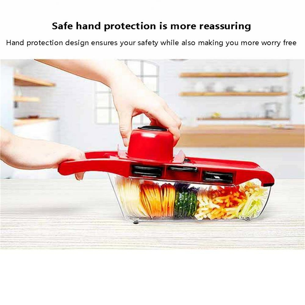 1. Machine multifonction pour couper les légumes : corps principal, 8 lames (coupe large/en bandes, coupe fine, coupe grossière, hachage, découpe en fleur), moulin à ail, protège-main, éplucheur, séparateur de protéines. 2. Matériaux sûrs et durables : lame en acier inoxydable, robuste et durable. Elle est fournie avec un protège-main pour éviter les blessures lors de la découpe des légumes.