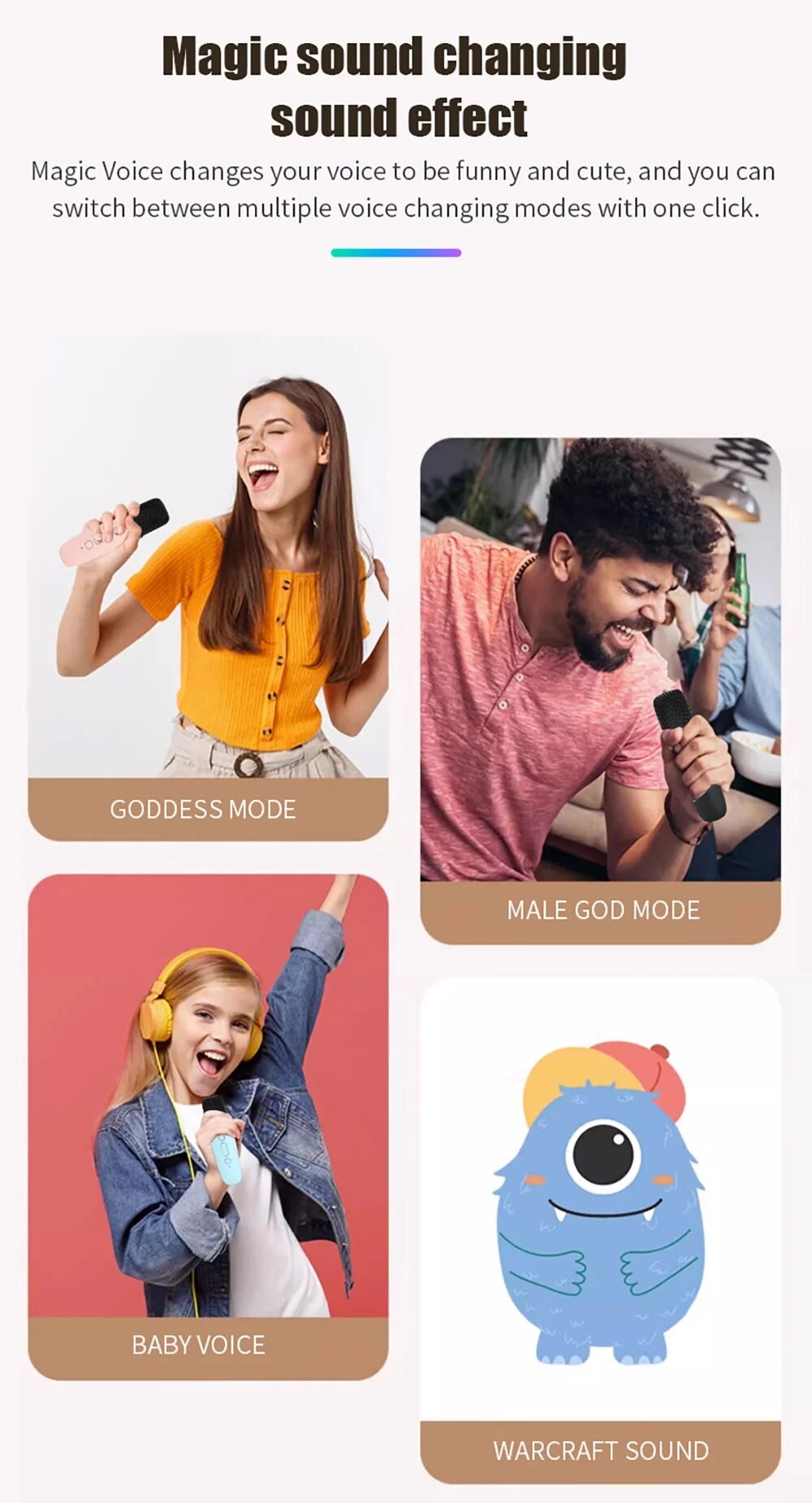 Multifonction Micro Karaoké: Micro Sans Fil équipe de 4 magiques sonores effets, changant votre accent par l'enceinte portable, c'est intéressants et amusants pour les enfants. LED lumières pulsent au rythme de la musique, créant une atmosphère sympa, KTV mode commence.