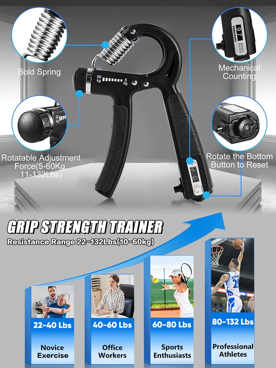 【CARGE RÉGLABLE】 L'exercice pour les mains dispose d'un bouton réglable pour modifier le niveau de résistance de 5 à 60 kg.Tournez le bouton pour augmenter progressivement la charge et améliorer votre prise en main au fil du temps