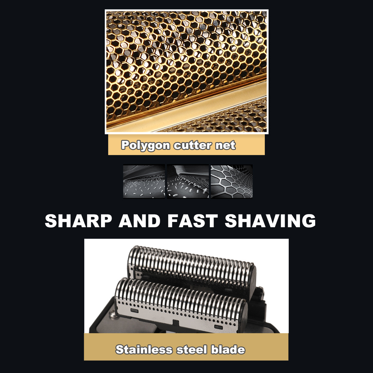 MAGIC CUT BALD & REMOVE STUBBLE: تحتوي على شفرتين مستقلتين من الفولاذ المقاوم للصدأ مع شبكة مضلعة تلتقط المزيد من الشعر، مما يزيد من مساحة الحلاقة لتسهيل الاستخدام وتوفير الوقت. تمكنك هذه التقنية من الحصول على حلاقة دقيقة جدًا حتى في حالة الحلاقة السريعة.