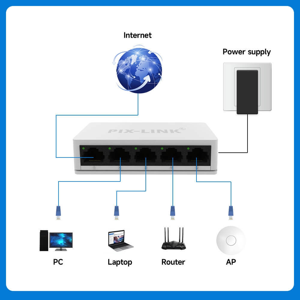 Switch de bureau – Nombre de Ports: 5 ports RJ45 – Normes Réseau: 10/100 Mbps AUTO Négociation / AUTO MDI / MDIX – Indicateur LED – Plug and Play sans configuration – Alimentation : 100-240VAC , 50/60Hz – Matériel: Plastique ABS – Compatibilité standard: IEEE 802.3, IEEE 802.3i, IEEE 802.3u, IEEE 802.3x / CSMA / CD - Couleur: Blanc - Adaptateur DC : 5v
